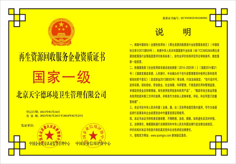 当前位置:首页 > 证书查询 > 北京天宇德环境卫生管理有限公司
