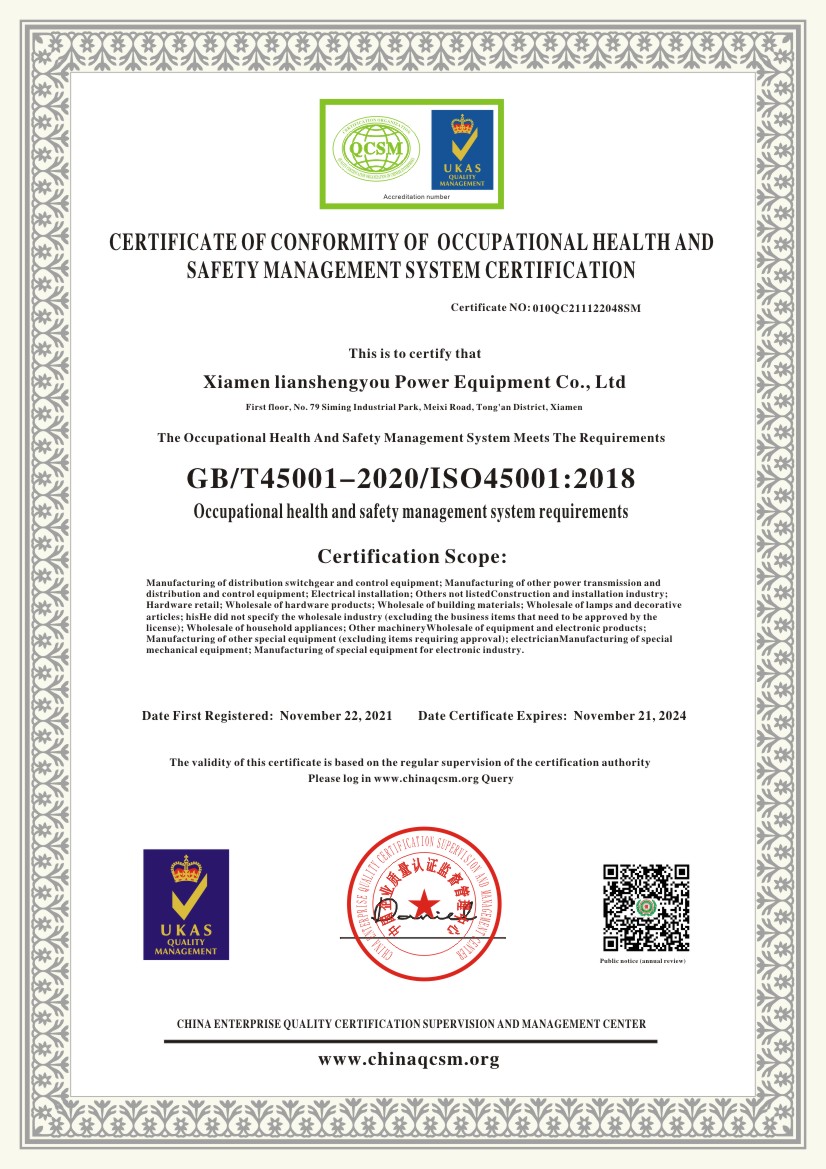 当前位置:首页 > 证书查询 > Xiamen lianshengyou Power Equipment Co., Ltd