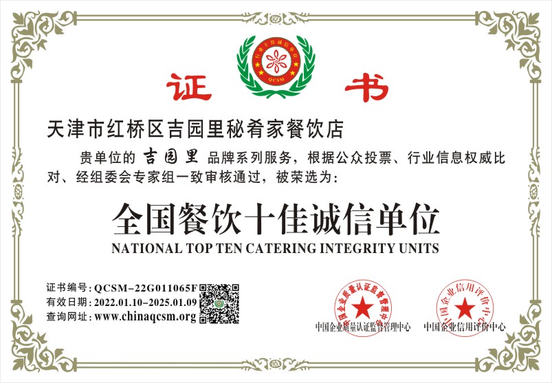 当前位置:首页 > 证书查询 > 天津市红桥区吉园里秘肴家餐饮店