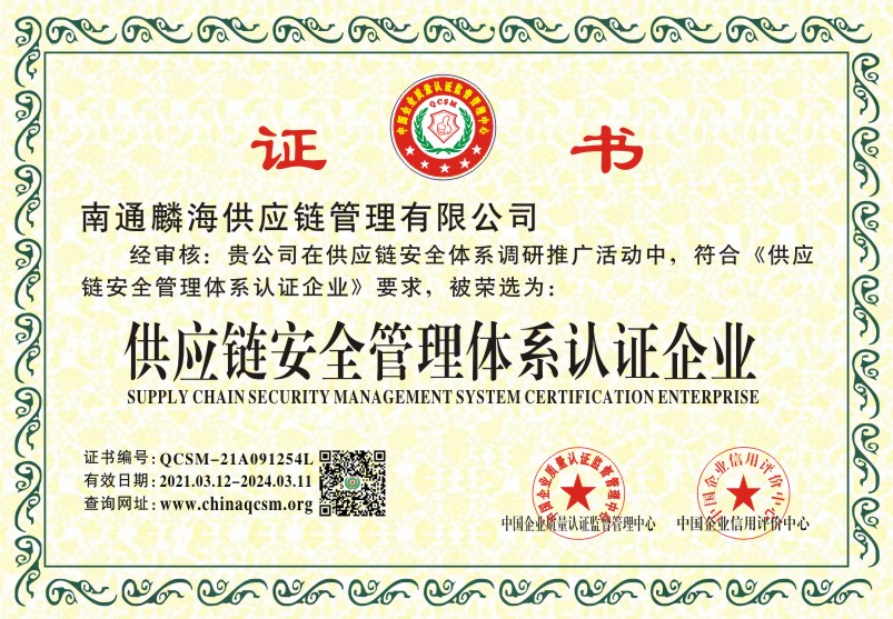 当前位置:首页 > 证书查询 > 南通麟海供应链管理有限公司