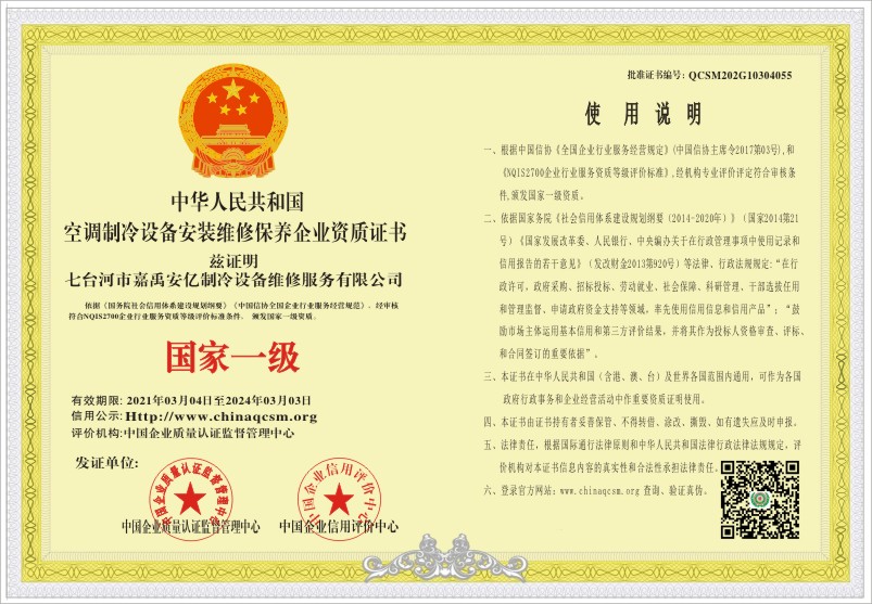 当前位置:首页 > 证书查询 > 七台河市嘉禹安亿制冷设备维修服务有限公司