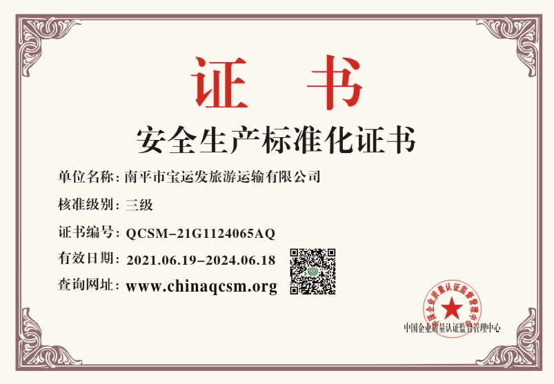 当前位置:首页 > 证书查询 > 南平市宝运发旅游运输有限公司