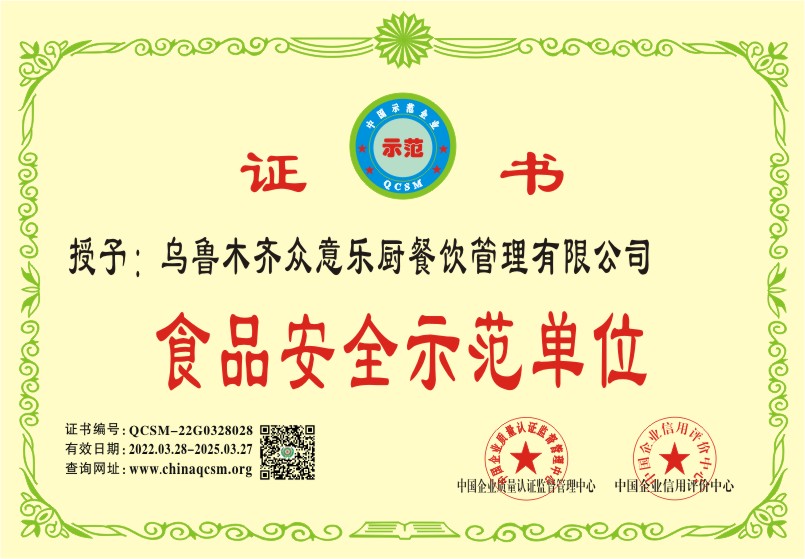 当前位置:首页 > 证书查询 > 乌鲁木齐众意乐厨餐饮管理有限公司