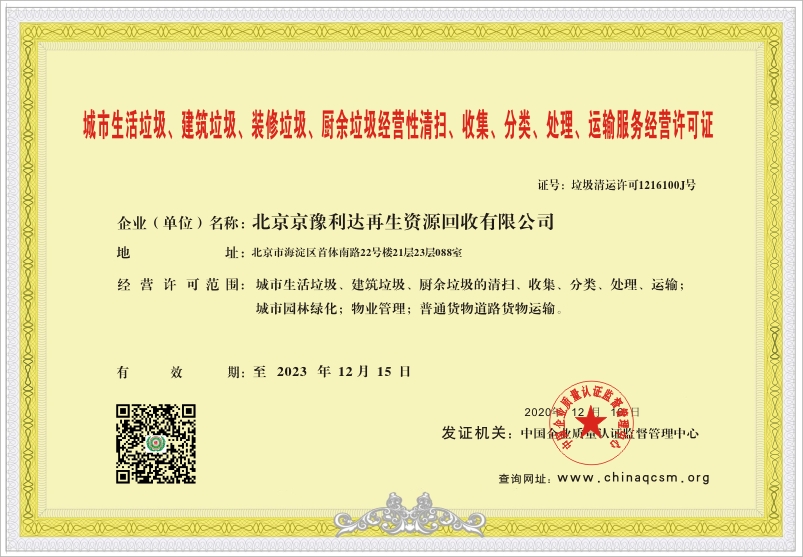 当前位置:首页 > 证书查询 > 北京京豫利达再生资源回收有限公司